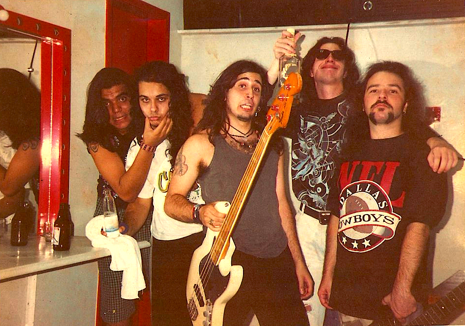 E, juro, foram muitos autógrafos. Éramos excelentes imitadores, embora todos da banda achassem ridículo copiar roupas e trejeitos da banda matriz, como os outros cover. Éverson, o vocalista da U2 Cover, só falava em inglês no dia do show e realmente acreditava ser o líder da banda irlandesa; no fim de carreira, juntando canções de U2 e Legião fez um combo Bono—Renato Russo… pague por um mala e leve dois. Ganhou muita grana com isso; o máximo que consegui foi juntar 300 dólares para descolar uma jaqueta italiana Perfecto (genuína). Assim cruzamos o país para levar a mensagem de metal, psicodelia e anarquia da banda de San Francisco. No sul, completamente chapados, tocamos o repertório inteiro do FNM em ritmo reggae; revoltados, os fãs nos deram uma surra de latinhas de cerveja e garrafas de pinga, mas ficamos firme arreggueando todas as canções até o fim. Claro, atravessamos o país sempre de ônibus, ao contrário das outras cover, que faturavam bem mais e viajavam de avião. Uma das raras trips pelo ar foi para Aracaju, conforme registrada aí acima, no camarim de uma boate cujo nome me escapa.