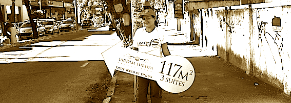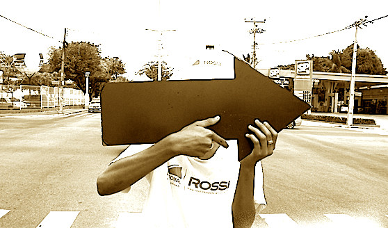 Se o meio é a mensagem, como dizia McLuhan, que mensagem nos transmitem os infelizes homens-seta? Eles não estão ali: apontam para outro lugar. Sem-teto, ao desabrigo do sol e da chuva, lembram à enriquecida nova classe média que ali perto há um bom lugar para viver. Se o meio é a mensagem, o homem-seta diz: “Veja, não estou aqui, não sou mais um humano – sou só um cabide, um poste, uma dica, um sinal. Abdiquei de minha natureza; me transformei em ‘2 e 3 dorms'”. Um homem-seta empunha seu cartaz como uma guitarra: ironia ou nostalgia da humanidade?