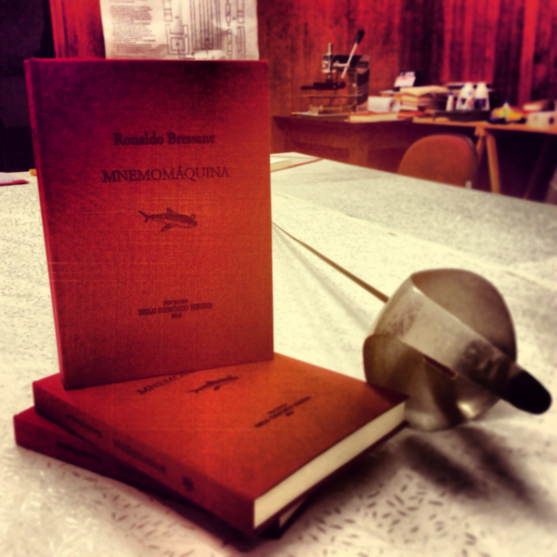 Um dos pilares da Mnemomáquina é: “O futuro está no passado“. Daí criamos este livro em edição artesanal: capa em tecido escarlate, como os códices do século 14, impressão em clichês tipográficos (técnica do século 18), mancha gráfica em proporção áurea (descoberta no século 16) toda em fonte Garamond (também datada do século 16), vinhetas gráficas em uma cor e acabamento inteiramente à mão. (Ok, o miolo é impresso em gráfica digital, mas nem tudo é perfeito.) A tiragem, única e numerada, restringe-se a 40 exemplares (a R$ 50). Há livros demais no mundo — e poucos podem ser passados direto do escritor ao leitor, de mão a outra. Como antigamente. Como pode voltar a acontecer no futuro.