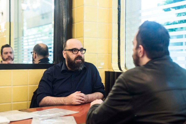 Ainda estava fechado o café da Livraria da Vila – cujas vitrines exibiam o inusitado encontro entre uma biografia de Donald Trump e um livro sobre gênios –, então fomos desviando das poças d’água do Jardim Paulista até o Frevinho, onde um dos principais encenadores do país bate cartão para celebrar os tradicionais beirutes. No percurso, o carioca de 45 anos falava sobre seu desprezo por café da manhã (boêmio caseiro, dorme às 6h todo dia e acorda quase na hora do almoço), o pânico de avião em dias chuvosos (escolheu a Dutra em vez da ponte aérea), o conservadorismo do Paraná (onde morou duas décadas), a dramaturgia achada nos meandros da biblioteca de José Mindlin (a peça que acaba estrear no Sesc Vila Mariana, Selvageria), o amor e a aversão às universidades (começou três mas nunca se formou) e a dificuldade em desapegar dos milhares de livros e vinis atulhando o apartamento dividido com a estilista Mariana Prates (sua musa há 12 anos).